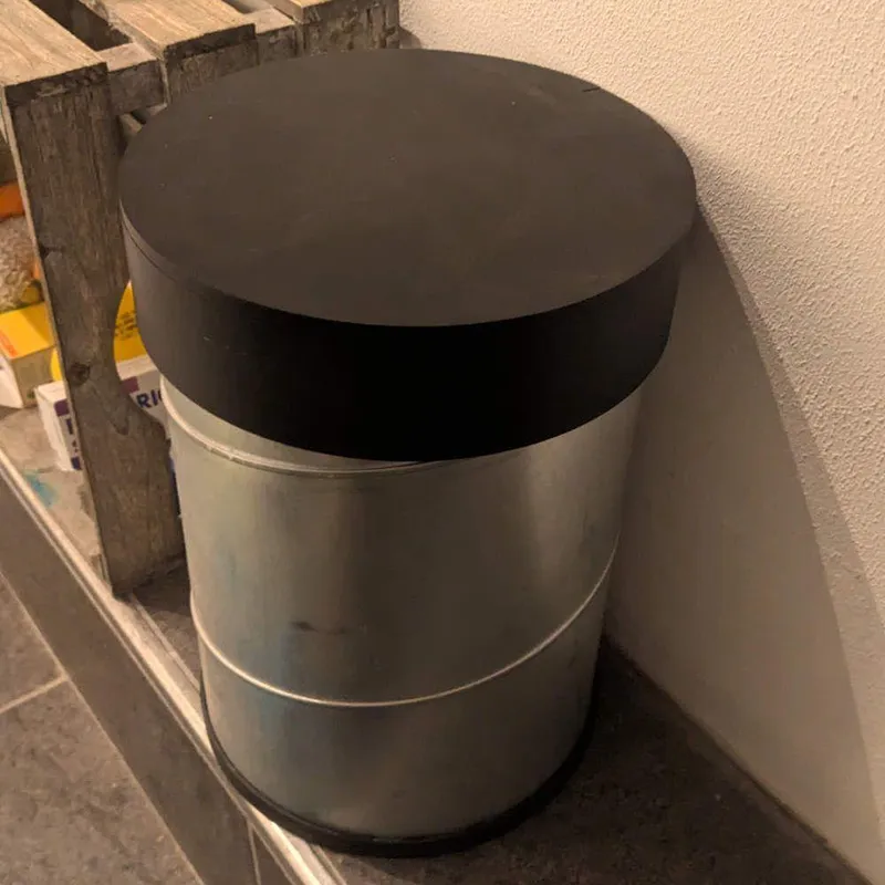 Die Idee entstand aus einem alltäglichen Problem: Müllbeutel, die sich nicht verstecken lassen und ein ungenutztes Wickelfalzrohr im Keller. Der schmale Innenrahmen hält den Beutel sauber gespannt, während der breite Überwurfrahmen ihn vollständig verdeckt. So wird aus einem funktionalen Gegenstand ein unaufgeregtes, geordnetes Objekt, das sich in den Raum einfügt, ohne Aufmerksamkeit zu verlangen.