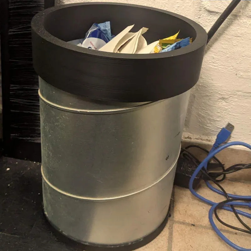 Dieser Mülleimer ist ein kleines Experiment mit industriellem Material und präziser 3D-Fertigung. Das Grundelement ist ein 200-mm-Wickelfalzrohr, ein Bauteil, das normalerweise in Lüftungsanlagen verschwindet und hier bewusst sichtbar bleibt. Die gedruckten Rahmen greifen diese Schlichtheit auf: Sie fassen das Metall, schützen die Kanten und geben dem Objekt seine ruhige, klare Form.