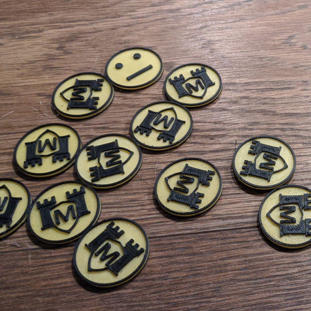 Die Token bestehen aus jeweils zwei gedruckten Teilen – Vorder- und Rückseite – die zu einem stabilen Element verbunden werden.
